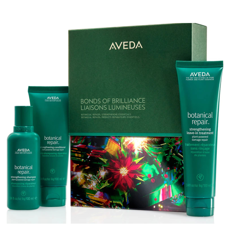 The Aveda Bonds Of Brilliance Botanical Repair Strengthening Essentials Gift Set is a limited-edition trio that strengthens, repairs, and protects all hair types with plant-powered bond-building technology for healthier, more resilient hair.