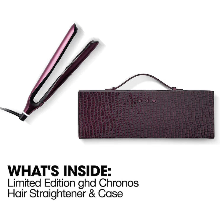 Step into a season of high-glamour styling with the ghd Chronos™ Hair Straightener Limited Edition Cherry Chic, the latest evolution in professional styling innovation. Dressed in a rich cherry red finish and presented in a travel-inspired vanity case¹, this limited-edition tool combines luxury design with advanced technology for effortlessly sleek, glossy, and long-lasting results.