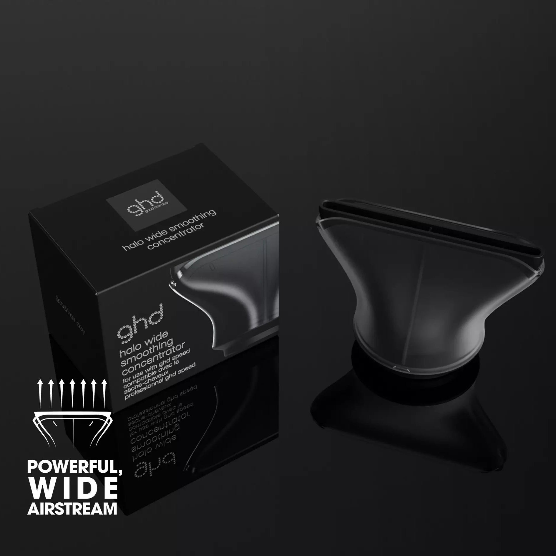 Fully compatible with the ghd Speed ionic hair dryer, the strong magnetic connection locks the nozzle securely into place in seconds and adjusts effortlessly during styling. The transparent outer shell showcases the advanced dual-airflow technology at work - performance you can see and feel.