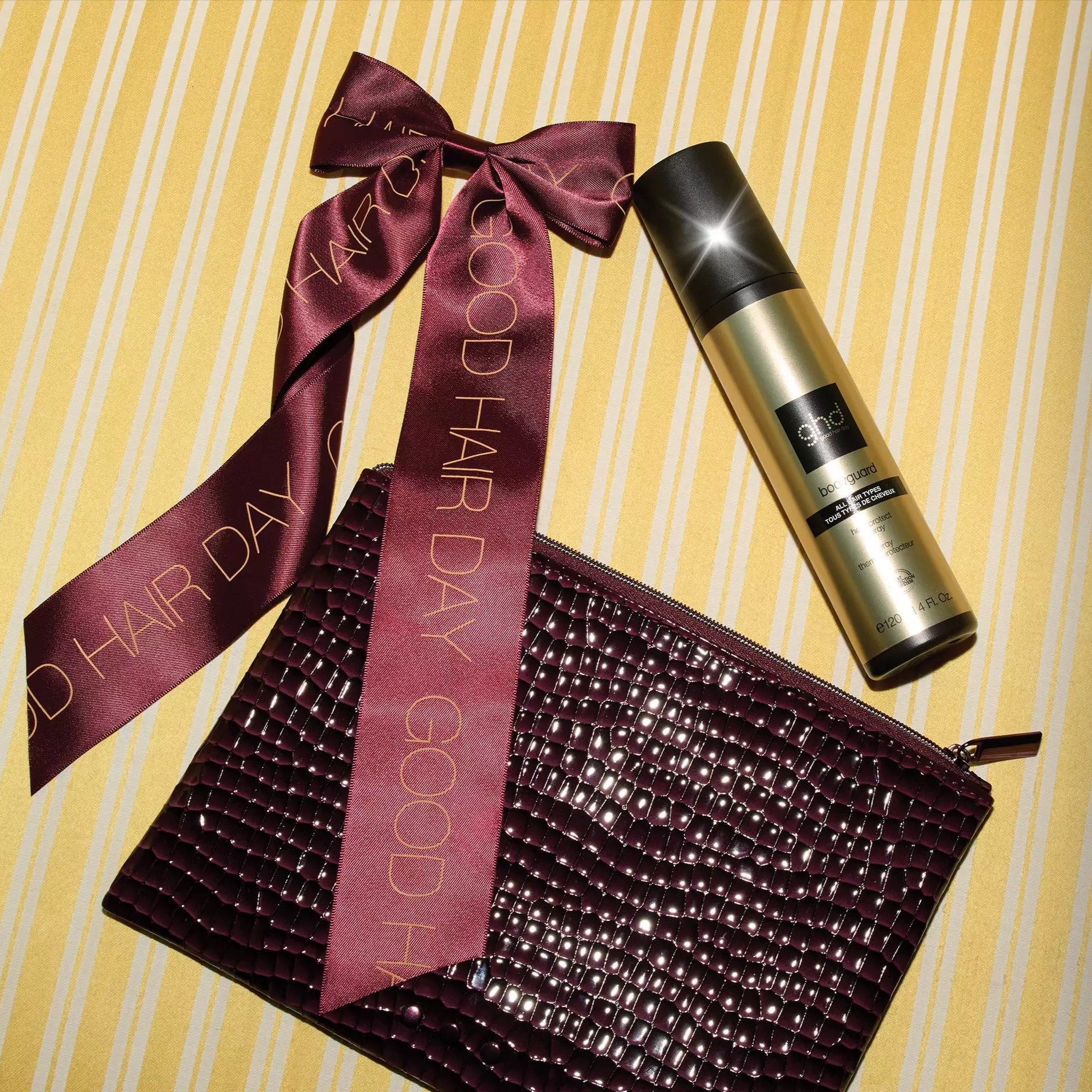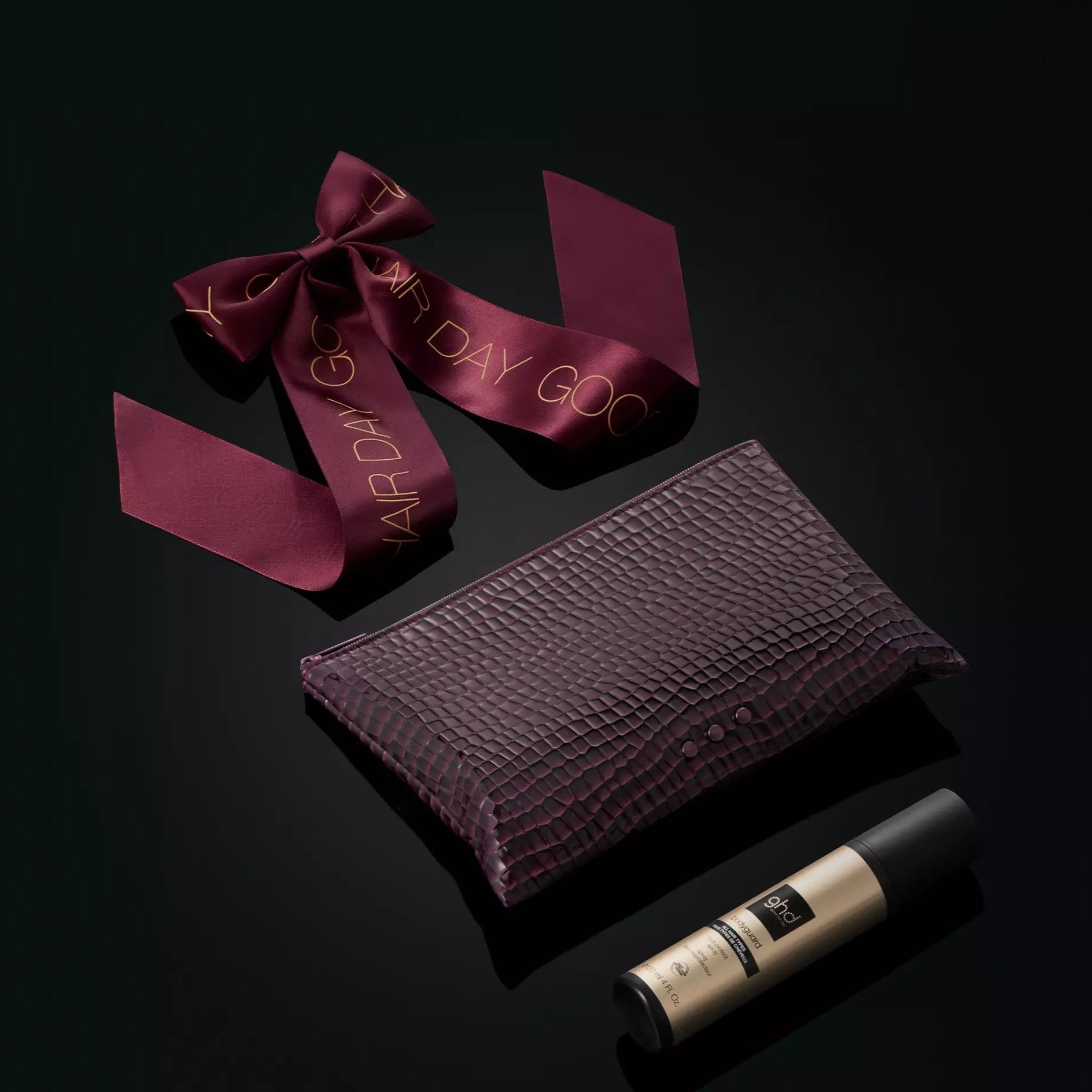 Inside this cherry-hued wash bag, discover the ghd Bodyguard – Heat Protect Spray for all hair types, your first-class defence against heat styling. Expertly formulated for all hair types, this lightweight mist creates an invisible shield against everyday heat damage, ensuring smooth, sleek and protected strands with every look. Complete your style with the limited-edition ghd hair clip, adorned with a satin bow — the perfect finishing touch for your festive ensemble.