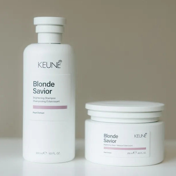 The Keune Blonde Savior Brightening Shampoo 300ml gently cleanses while enhancing brightness, shine, and vibrancy for natural, highlighted, and bleached blonde hair.