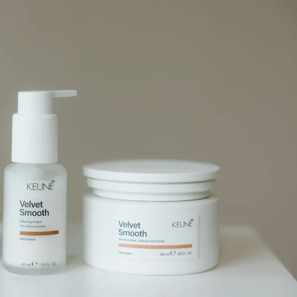 Experience intensive smoothing care with Keune Velvet Smooth Anti-Frizz Mask, a rich and nourishing treatment for unruly, frizz-prone hair. This clinically proven formula deeply hydrates and repairs while sealing the cuticle to lock in smoothness. The result is hair that feels softer, silkier, and beautifully manageable—with sleek results that last.