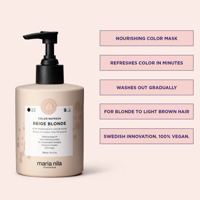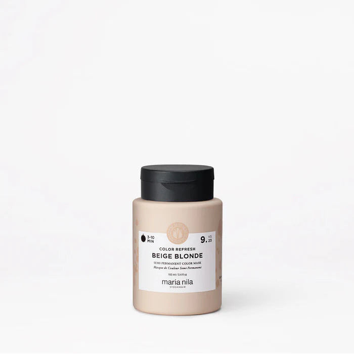 The Maria Nila Colour Refresh Semi-Permanent Colour Masque – Beige Blonde is a nourishing vegan hair mask that adds a cool, sandy beige tone to blonde hair while boosting shine and hydration for 4–10 washes.