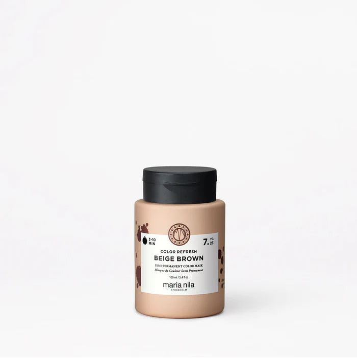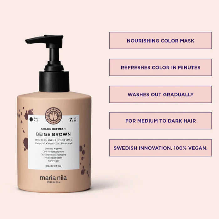 The Maria Nila Colour Refresh Semi-Permanent Colour Masque – Beige Brown is a nourishing vegan hair mask that refreshes medium to dark hair with a soft beige-brown tone while boosting shine and hydration for 4–10 washes.