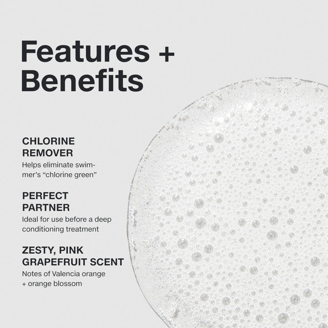 The deep-cleansing formula works to remove chlorine, iron, and minerals that accumulate in the hair, leaving it feeling fresh, clean, and restored.