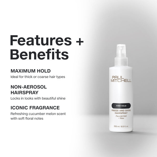 The Paul Mitchell Freeze and Shine Super Spray is specifically formulated to provide a frizz-free firm hold, making it ideal for those with thick or coarse hair types. Its enduring hold and shine-enhancing formula guarantee flawless hairstyles, reflecting confidence and vitality.